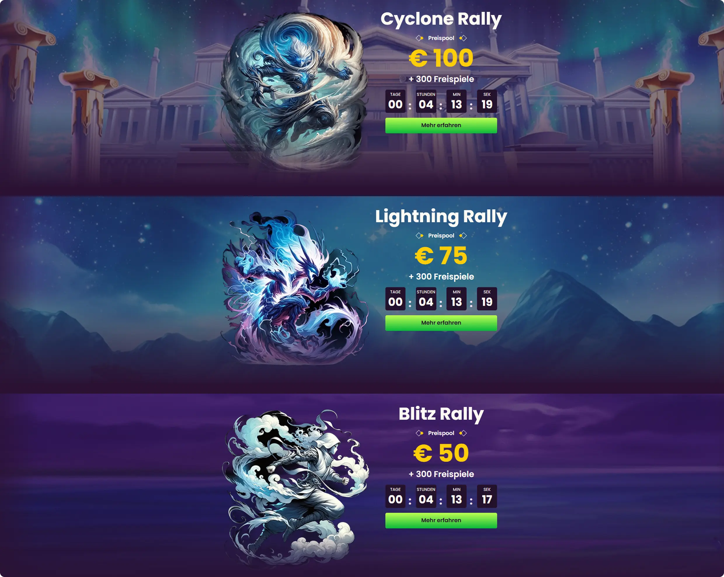 Die Preise reichen von Bargeld über Freispiele bis hin zu exklusiven Belohnungen, die direkt Ihrem Spielerkonto gutgeschrieben werden. Da laufend neue Turniere starten, lohnt es sich, regelmäßig im Turnierbereich vorbeizuschauen und keine Aktion zu verpassen. Jedes Turnier bringt neue Herausforderungen mit sich und die Chance, zusätzlich zu Ihren regulären Gewinnen weitere Preise zu ergattern.