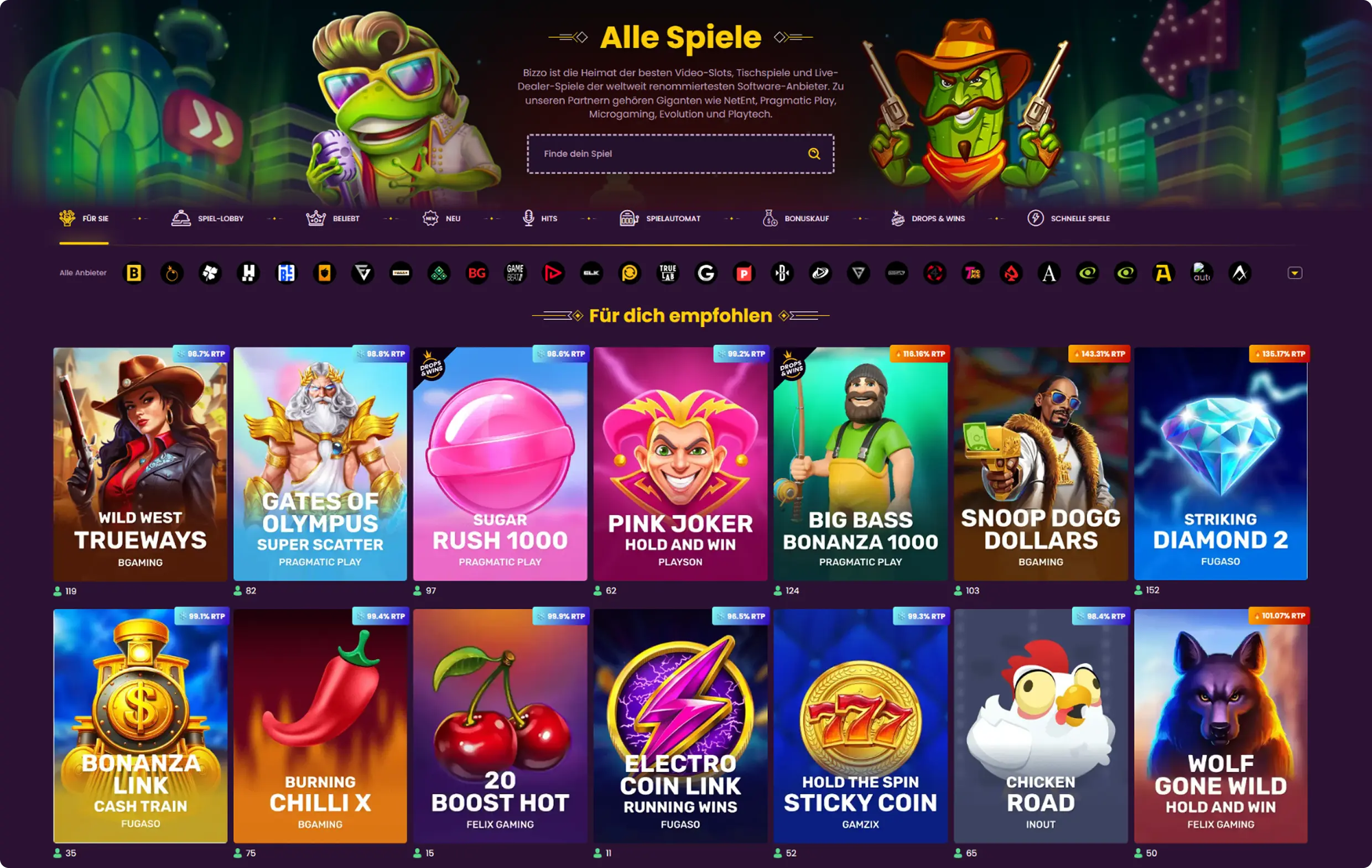 Im Bizzo Casino erwartet Sie eine riesige Auswahl an Spielautomaten, die für jeden Geschmack das passende Spiel bereithält. Mit tausenden Slots im Portfolio ist garantiert für Abwechslung gesorgt, und zwar von beliebten Klassikern bis hin zu den neuesten Veröffentlichungen mit spannenden Features. Alle Spiele sind übersichtlich in Kategorien sortiert, sodass Sie Ihre Favoriten schnell und unkompliziert finden.