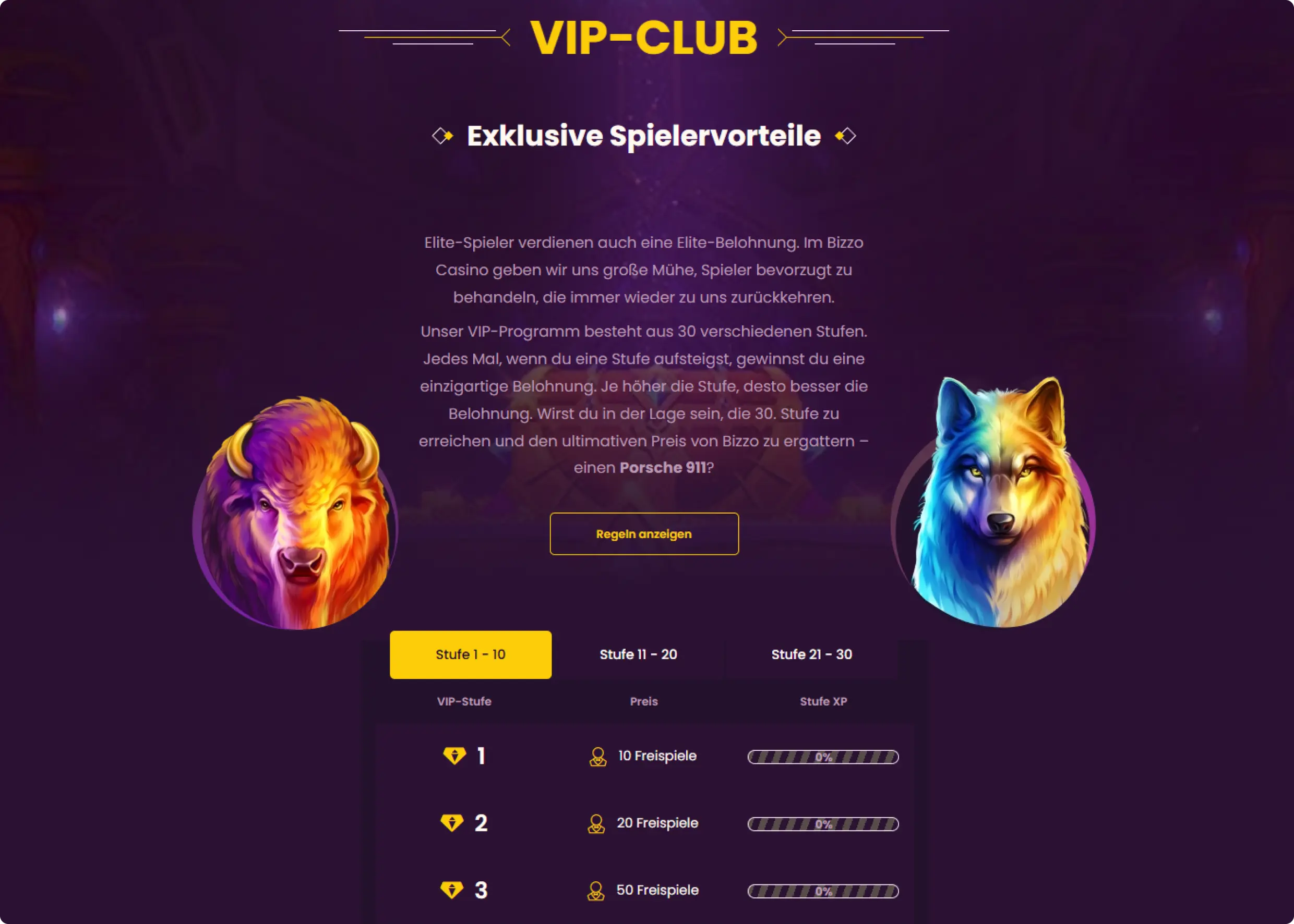 Das VIP-System von Bizzo Casino ist mit 30 Leveln sehr effektiv. Spielen Sie regelmäßig, bleiben Sie dabei, und sobald Sie das tun, wird das gesamte Erlebnis reibungsloser.